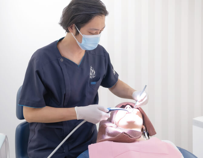歯科医師が口腔内を目視でチェックします。歯の状態、歯茎の色や腫れ、口内の粘膜の状態などを確認します。