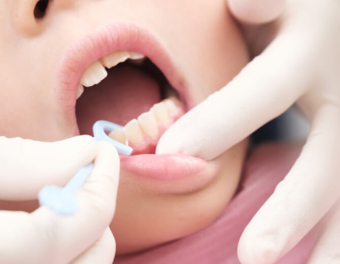奥歯の溝にシーラントを塗布し、虫歯の発生を防ぎます。